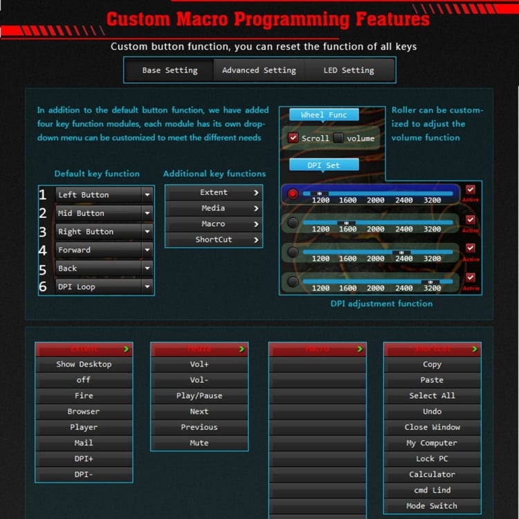 Adjustable DPI Switch: 1200/1600/2000/2400/3200 DPI.