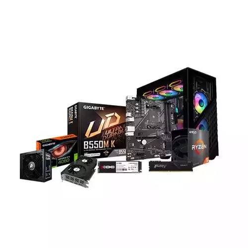 The AMD Ryzen 5 5600 processor comes with 6 cores and 12 threads, delivering outstanding multi-threaded performance for gaming and work. The Gigabyte B550M-K motherboard provides a stable platform with support for future upgrades. With 16GB of Kingston Fury 3200MHz DDR4 RAM, this PC delivers smooth multitasking.For graphics, the Gigabyte GeForce RTX 4060 WINDFORCE OC 16GB GDDR6 ensures stunning visuals and high FPS performance in modern games. The XOC G400 512GB PCIe Gen 4.0 NVMe SSD offers super-fast storage speeds, reducing load times for games and applications.The 1ST PLAYER DK PS-600AX 80 PLUS Bronze Gaming Power Supply ensures stable power delivery, while the 1STPLAYER D7 M-ATX RGB Gaming Case provides a stylish and functional design with RGB lighting and efficient cooling.