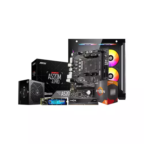 This desktop is powered by the AMD Ryzen 5 5600G processor (Chinese Edition), featuring 6 cores and 12 threads, capable of handling multitasking, productivity software, and casual gaming with ease. The processor includes integrated Radeon Graphics, eliminating the need for a dedicated GPU and providing decent graphics performance out of the box. Paired with the MSI A520M-A PRO motherboard, the system supports reliable performance and future upgradability within the AM4 platform. Memory is handled by two sticks of Apacer NOX 8GB DDR4 RAM (16GB total) clocked at 3200MHz, offering excellent multitasking capability and smooth application usage. For storage, a Pc Power Thunderstriker 512GB PCIe Gen3x4 NVMe M.2 SSD ensures fast boot times and quick file access. The system is powered by a Value-Top Neo Q450 450W non-modular PSU and housed in the stylish Maxcool Inferno MC5 Micro ATX gaming case, which provides good airflow and aesthetics to suit modern desk setups.