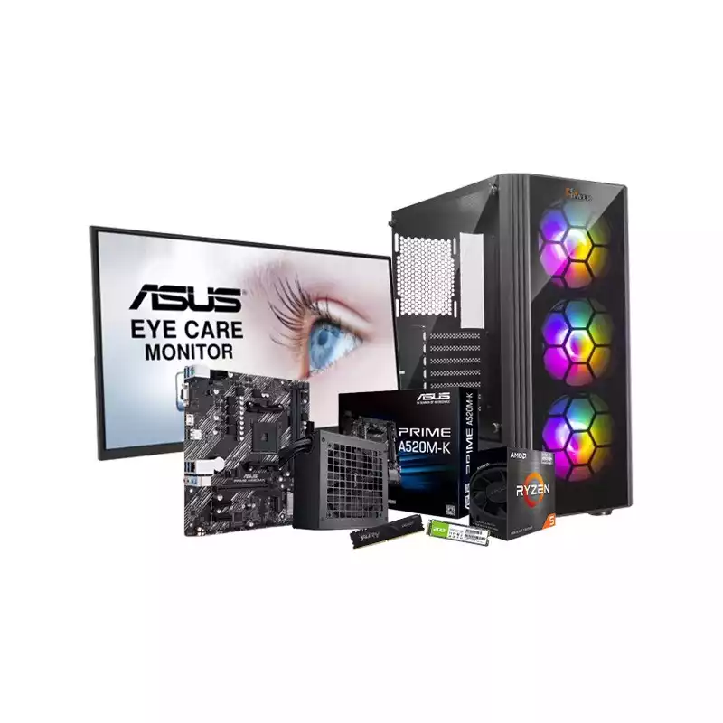 The AMD Ryzen 5 5600G Asus Prime A520M-K Motherboard 8GB RAM 256GB SSD Budget PC with 22 inch Monitor, a versatile and efficient system designed to meet your computing needs without breaking the bank. Powered by the AMD Ryzen 5 5600G 6 Core 12 Thread AM4 Processor with Radeon Graphics (Chinese Edition), this PC offers a seamless blend of CPU and GPU power, perfect for everyday tasks and casual gaming. The Asus Prime A520M-K AM4 Micro-ATX AMD Motherboard ensures stability and compatibility with a compact form factor. With Kingston Fury Beast 8GB 3200MHz DDR4 Desktop RAM, the system delivers reliable performance and responsiveness. The Acer FA100 256GB NVMe PCIe SSD provides fast storage access, offering ample space for your essential files and applications. The Deepcool PK450D 80 Plus Bronze Power Supply ensures efficient and reliable power delivery to all components, contributing to the system's stability. Housed in the stylish Pc Power PG-400 Spider Web Crystal ATX Gaming Case in sleek black, this PC not only performs well but also adds a touch of gaming aesthetics to your setup. To complete the package, the AMD Ryzen 5 5600G Budget PC comes with the Asus VZ22EHE Full HD IPS Eye Care 22-Inch Ultra-slim Monitor. Immerse yourself in vibrant visuals with this ultra-slim monitor, perfect for work and entertainment. Whether you're a student, professional, or casual gamer, this budget-friendly AMD Ryzen 5 5600G Budget PC with a 22-inch monitor is the ideal solution for those seeking a reliable and affordable computing experience.What is the AMD Ryzen 5 5600G Asus Prime A520M-K Motherboard 8GB RAM 256GB SSD Budget PC with 22 inch Monitor Price in Bangladesh 2025 ?