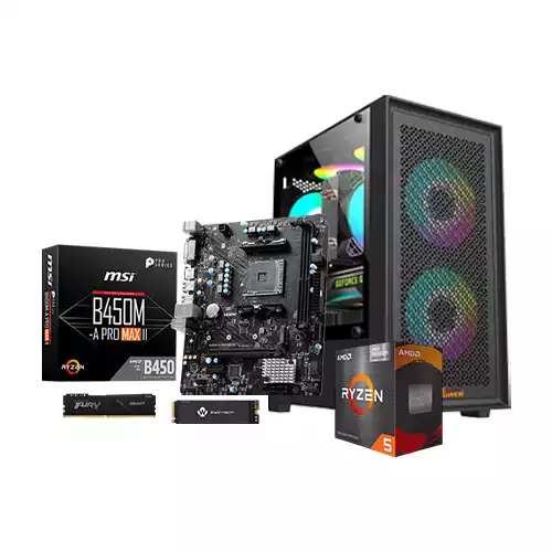 AMD Ryzen 5 5600GT MSI B450M-A PRO MAX II 8GB RAM 256GB SSD Gaming PC delivers dependable performance for gaming, everyday computing, and productivity tasks. Built around the Ryzen 5 5600GT processor, this setup offers six cores and 12 threads along with efficient Radeon Graphics, making it capable of handling entry-level gaming, multitasking, and office workloads with ease. The MSI B450M-A PRO MAX II motherboard ensures stable power delivery and long-term support, while the Kingston Fury Beast 8GB 3200MHz RAM provides consistent memory performance for smooth operation. A BIWINTECH NX500 256GB PCIe NVMe SSD offers fast application loading and system responsiveness, suitable for users who want quicker boot times and more rapid file access. Housed inside the Pc Power Dark Flow Mesh X2 Mid Tower M-ATX Case, the system maintains good airflow for better temperature control during extended use. This build is ideal for students, office users, and gamers seeking a budget-friendly PC with balanced components that can handle modern tasks without complications.