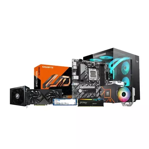 At the core of this desktop is the AMD RYZEN 5 7500F processor, featuring 6 cores and a boost clock up to 5.0GHz, built on the AM5 socket architecture. The system runs on a Gigabyte B850M D3HP Micro ATX motherboard, offering great connectivity and expandability. It’s powered by 16GB Kingston FURY BEAST DDR5 RGB RAM clocked at 6000Mhz , providing lightning-fast data access and multitasking capabilities. For storage, it includes a Kingston NV3 500GB NVMe M.2 PCIe Gen4 SSD, ensuring ultra-fast boot and load times. The system’s graphics performance is handled by the PNY GeForce RTX 5060 8GB OC Dual Fan GPU, supporting ray tracing, AI features, and 4K content. Thermal management is enhanced with the DeepCool AG500 ARGB GAMMAXX CPU cooler, ensuring cool and quiet operation. The setup is housed in a sleek Value-Top TYPHOON F5 ATX Gaming Case, powered by a reliable 1STPlayer PS-600AX 600W 80 Plus Bronze PSU, delivering stable and efficient energy.