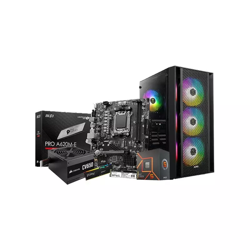 The AMD Ryzen 5 7600 MSI PRO A620M-E Motherboard 16GB RAM 500GB SSD Budget PC, a powerhouse designed for an exceptional gaming and multitasking experience. The heart of this desktop is the AMD Ryzen 5 7600 Gaming Processor, with speeds ranging from 3.8GHz to an impressive 5.1GHz, boasting 6 cores and a massive 38MB cache for seamless performance. Paired with the reliable MSI PRO A620M-E DDR5 AMD AM5 Motherboard, you can expect stability and efficiency in every operation. Elevate your gaming and computing with the Kingston Fury Beast 16GB 5600MHz DDR5 RGB Desktop RAM, providing lightning-fast data access and a touch of customizable flair with RGB lighting. Storage won't be a concern, thanks to the Team MP44L 500GB M.2 PCIe Gen4 Nvme SSD, ensuring rapid data transfer and ample space for your games and applications. Powering this budget-friendly beast is the Corsair CV Series CV650 650 Watt 80 Plus Bronze Certified Power Supply, delivering reliable and efficient energy to all components. The system is housed in the stylish Gamdias Aura GC2 Perforated RGB Mid-Tower Case, providing not just performance but also aesthetic appeal with its RGB lighting and perforated design for optimal airflow. Whether you're a casual gamer or a multitasking enthusiast, this AMD Ryzen 5 7600 Budget PC is crafted to meet your computing needs without breaking the bank. Unleash the power of cutting-edge technology at an affordable price. Upgrade your setup and experience a new level of performance with this budget-friendly desktop PC.| Processor | |