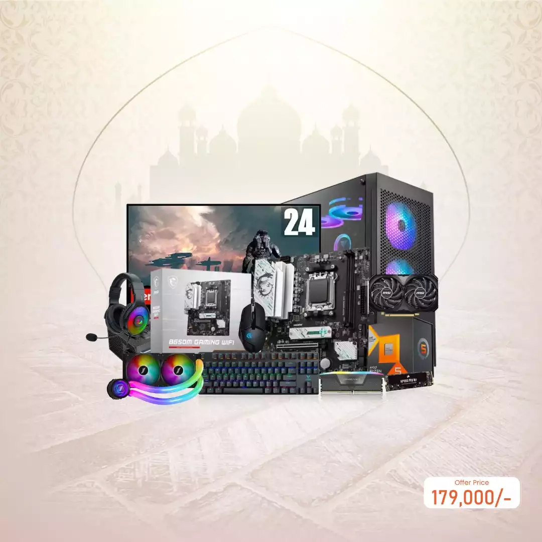 AMD Ryzen 5 7600X3D Gaming PC, available at Tech Land BD, is a powerhouse built for high-performance gaming and content creation. Featuring the AMD Ryzen 5 7600X3D processor with 6 cores and 12 threads, this PC delivers outstanding speed and efficiency for gaming and multitasking. It is paired with the MSI B650M GAMING Plus WIFI motherboard, ensuring seamless connectivity and future upgradeability. The MSI GeForce RTX 4060 Ti VENTUS 2X 8GB OC graphics card enhances visuals with ray tracing and DLSS 3.0, offering stunning, smooth gameplay at high frame rates. Equipped with 32GB Corsair VENGEANCE RGB DDR5 RAM (6000MHz), this system guarantees ultra-fast performance and responsiveness. Storage is handled by the Corsair MP600 PRO NH 1TB PCIe Gen4 NVMe SSD, providing blazing-fast load times for games and applications. Keeping the CPU cool is the 1STPLAYER MT240 Infinite Space ARGB Liquid Cooler, ensuring stable thermal performance even during intense gaming sessions. The ANTEC ATOM B650 80 PLUS BRONZE 650W power supply delivers reliable energy efficiency, while the GAMDIAS TALOS E3 Mesh Mid-Tower case offers excellent airflow and RGB aesthetics. The setup is completed with a Lenovo G24-20 24-inch FHD 165Hz IPS Gaming Monitor, delivering ultra-smooth visuals. Accessories include the Logitech G402 Hyperion Fury gaming mouse, Rapoo V500PRO-87 mechanical gaming keyboard, and Redragon Pandora H350-1 RGB wired gaming headset, ensuring a premium gaming experience. Whether you are a professional gamer or a content creator, this high-end gaming PC provides unmatched performance. Order now from Tech Land BD and take your gaming experience to the next level!