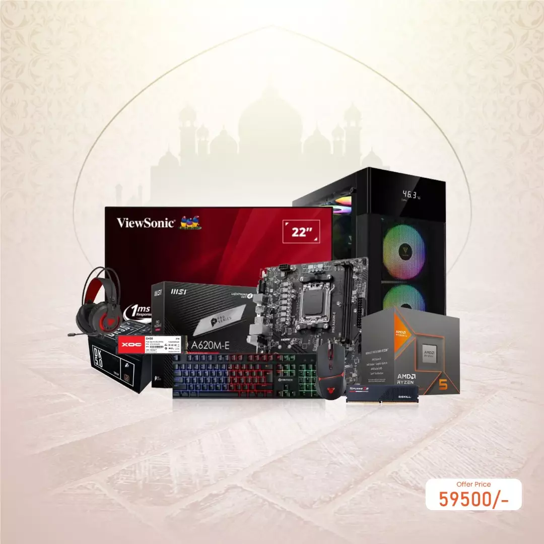 AMD Ryzen 5 8500G MSI PRO A620M-E DDR5 16GB RAM 512GB SSD Gaming PC with ViewSonic VA2209-H-2 Monitor is a budget-friendly yet powerful gaming setup designed for gamers and professionals in Bangladesh. This system is powered by the AMD Ryzen 5 8500G 6-Core 12-Thread AM5 Processor with Radeon Graphics, delivering excellent performance for gaming, multitasking, and productivity. The MSI PRO A620M-E DDR5 AM5 Motherboard ensures stability, expandability, and seamless performance with modern connectivity options. Equipped with 16GB of G.SKILL Ripjaws S5 5600MHz DDR5 RAM, the system offers high-speed data processing, smooth multitasking, and reduced load times for games and applications. The XOC G400 512GB M.2 2280 PCIe 4.0 NVMe SSD provides ultra-fast boot times, data transfer speeds, and ample storage for essential games and software. To ensure efficient power delivery, the system is equipped with a 1STPLAYER DK5.0 PS-500AX 500W 80 PLUS Bronze Certified Non-Modular Power Supply, offering stable performance with energy efficiency. The Gamdias AURA GC5 Mesh RGB Digital Display Mid-Tower ATX Gaming Case enhances the aesthetics with its stylish RGB lighting and airflow optimization. The package also includes a ViewSonic VA2209-H-2 22-Inch 100Hz Full HD IPS Monitor, delivering sharp visuals, vibrant colors, and smooth refresh rates for an immersive gaming experience. To complement the setup, the Fantech Crypto VX7 USB Gaming Mouse, Fantech K614L Fighter III Gaming Keyboard, and Fantech HG20 Chief II 3.5mm Plug RGB Gaming Headset provide a premium gaming experience with responsive controls, customizable RGB lighting, and crystal-clear audio. Available now at Tech Land BD, this gaming PC is an ideal choice for gamers and professionals seeking high performance at an affordable price.