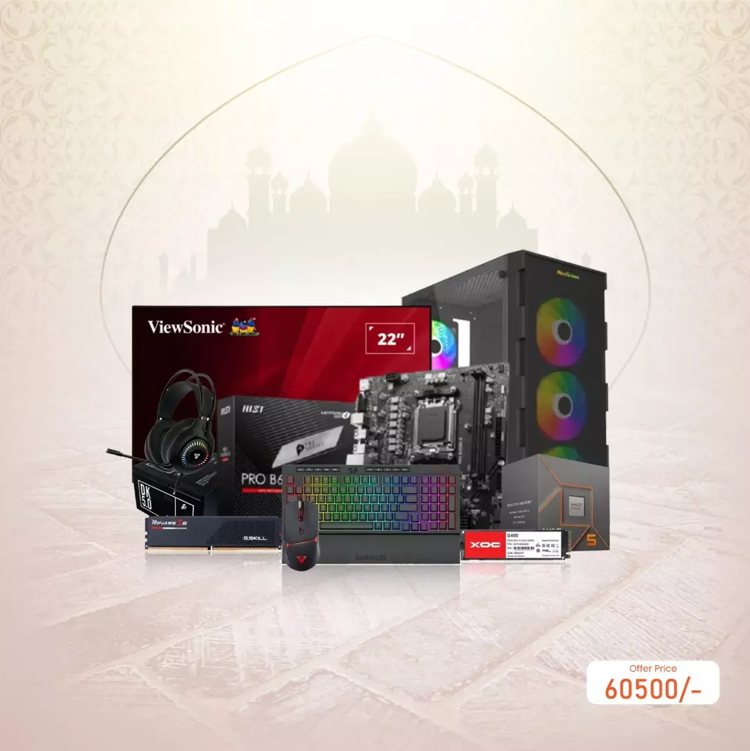 Step into the future of computing with this AMD Ryzen 5 8500G-powered desktop PC, featuring the latest AM5 platform, DDR5 memory, and PCIe 4.0 storage. Designed for gamers, creators, and power users, this build delivers cutting-edge performance with integrated Radeon graphics and a stunning 22-inch FHD monitor.