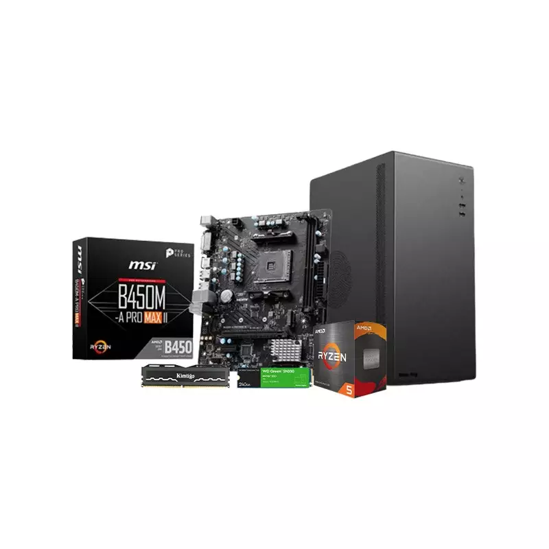 The AMD Ryzen 5 5600G 6 MSI B450M-A PRO Motherboard 8GB RAM 240GB SSD Corporate PC, a high-performance desktop solution designed for optimal efficiency and productivity. With cutting-edge components, this system is tailored to meet the demands of professional workloads and provide a smooth computing experience. At the heart of this Corporate PC is the AMD Ryzen 5:5600G processor, featuring 6 cores and 12 threads. With AM4 compatibility and integrated Radeon graphics, this processor delivers impressive performance for both CPU-intensive tasks and graphics-intensive applications. Complementing the powerful Ryzen processor is the MSI B450M-A PRO MAX II motherboard, an AMD AM4 DDR4 ATX motherboard that ensures stability and reliability. With DDR4 support, this motherboard provides a solid foundation for your system, allowing for seamless multitasking and efficient data handling. The KIMTIGO Wolfrine UDIMM 8GB DDR4 3200MHz RAM ensures smooth and responsive performance, enhancing your ability to handle multiple tasks simultaneously. The inclusion of a Western Digital Green SN350 240GB M.2 NVMe Gen3 SSD takes the system's speed to the next level, offering rapid boot times and quick access to your applications and files. Housed in the sleek and compact Value-Top V200 Micro ATX casing, this Corporate PC not only performs exceptionally well but also adds a touch of modern aesthetics to your workspace. The compact design makes it suitable for various environments, whether it's an office setup or a home workspace.-