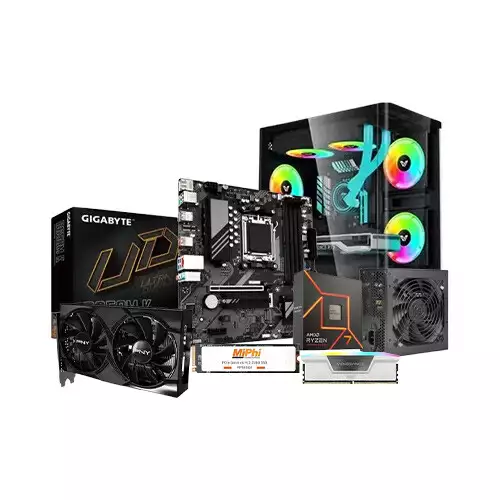 Experience next-level gaming performance with the AMD Ryzen 7 7700 Gigabyte B650M K 16GB RAM 512GB SSD Gaming PC featuring the RTX 5060 8GB, now available at Techland BD at the best price in Bangladesh. Powered by the AMD Ryzen 7 7700 8-core processor, this build delivers outstanding multitasking power and smooth gameplay, making it perfect for gaming, content creation, and productivity. The GIGABYTE B650M K AM5 DDR5 motherboard ensures stability and future upgradability with support for the latest technologies. With 16GB Corsair VENGEANCE RGB DDR5 6000MHz RAM, you get ultra-fast memory performance and stunning RGB lighting for a premium look. The MiPhi MP500G4 512GB NVMe Gen4 SSD offers lightning-fast storage, reducing load times and improving system responsiveness. At the heart of this rig lies the PNY GeForce RTX 5060 8GB OC Dual Fan Graphics Card, delivering immersive graphics, real-time ray tracing, and AI-enhanced gaming visuals. The system is housed in a stylish Value Top NUBIA 20F5-MI Micro-ATX Gaming Case, featuring five built-in ARGB fans for superior cooling and vibrant aesthetics. Powering the system is the reliable ANTEC ATOM B550 550W 80 PLUS Bronze PSU, ensuring stable and efficient power delivery. Backed by a 3-year warranty, this gaming PC is built for performance, reliability, and style — the ideal choice for serious gamers and creators alike.