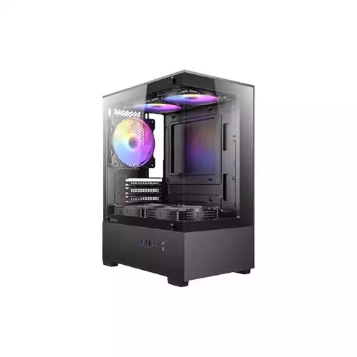 Antec VCX100M ARGB Mini Tower Gaming Case is a stylish and compact gaming chassis designed for gamers who demand both performance and aesthetics. Built with durable steel, plastic, and tempered glass, this case features panoramic 270° tempered glass side panels that showcase your components and ARGB lighting setup in full glory. It comes with 5 pre-installed 120mm fixed mode ARGB fans (2 on top, 2 on the PSU shroud, and 1 at the rear), ensuring excellent airflow with its vertical airflow design that channels cool air from bottom to top for improved thermal performance. Supporting Micro-ATX and ITX motherboards, the VCX100M provides flexibility for compact gaming builds while maintaining efficient cooling. The case includes 4 expansion slots, space for 1 x 3.5" HDD and 1 x 2.5" SSD, and clearance for CPU coolers up to 160mm, GPUs up to 275mm, and PSU length up to 160mm with cables. Its I/O panel provides easy access with USB 3.0, dual USB 2.0, mic/headphone jacks, power, reset, and LED control button. Weighing just 3.2kg with compact dimensions (30 x 19.5 x 39 cm), this mini tower is lightweight yet sturdy, making it perfect for gamers who want a portable and space-saving gaming setup. With premium ARGB lighting, efficient cooling, and a sleek black design, the Antec VCX100M ARGB is an excellent choice for budget-friendly gaming builds in Bangladesh.