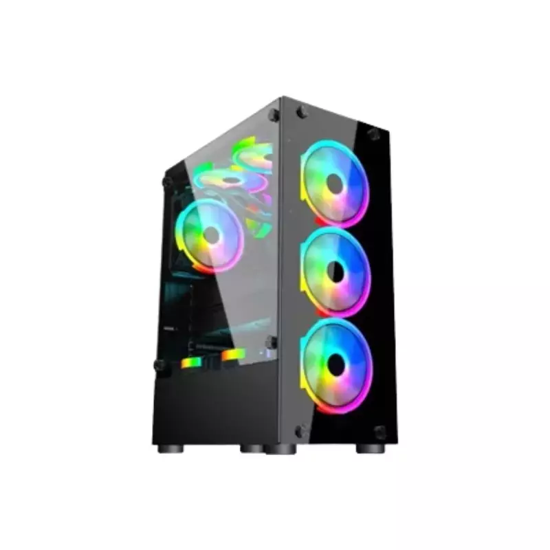 The Aptech AP-8307B ARGB Gaming Case, available at TechLand BD, is a high-quality gaming case designed for performance and aesthetics. The chassis is made from 0.45mm SPCC with a black painting finish, ensuring durability and a sleek look. The front panel features a tempered glass design, providing excellent airflow for cooling. It includes a USB3.0 port, two USB1.0 ports, and an audio port for easy connectivity. The left side panel is made of tempered glass, allowing you to showcase your components. The case supports ATX/Micro ATX motherboards and has seven PCI slots for expansion cards. It has a compact size of L380W190H447 MM and weighs 3.9 KGS (N.W.) and 4.6 KGS (G.W.). It can accommodate a VGA card up to 305 MM and has a maximum GPU height of 165 MM.