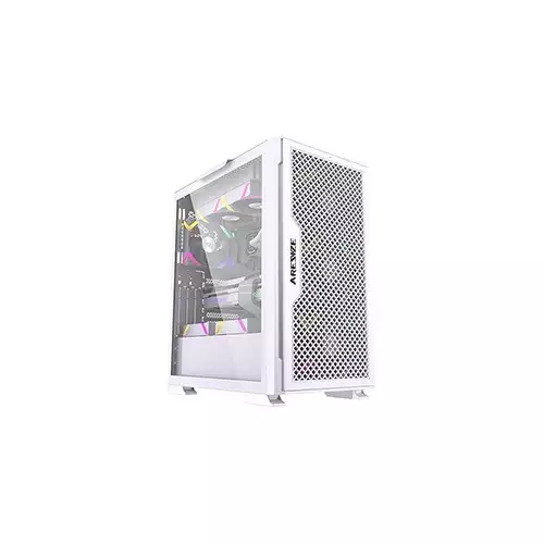 The ARESZE KT02W E-ATX Mid-Tower Desktop Gaming Case is a robust and versatile option for gaming enthusiasts. Crafted from durable aluminum, this case supports M-ATX and ITX motherboards. It features a sleek tempered glass left side panel, offering a clear view of the internal components and a stylish aesthetic. The front panel includes a USB 3.0 port, a USB 3.1 Type C port, and HD audio jacks, ensuring modern connectivity options. Additionally, the case comes with one ARGB fan that can be synced with the motherboard and controlled via the reset button. It supports GPU coolers up to 300mm in height and CPU radiators up to 161mm, providing ample space for high-performance cooling solutions. The main body of the case measures 380.5x291x190mm, and it supports up to six 120mm fans for optimal airflow.