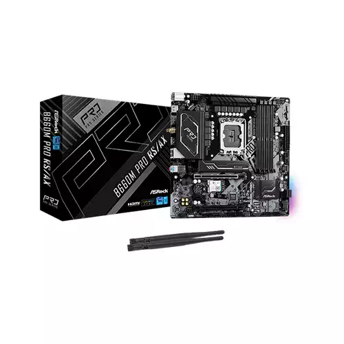 The ASRock B660M PRO RS/AX is a versatile Micro ATX motherboard built for 12th and 13th Gen Intel Core processors on the LGA 1700 socket. Featuring the Intel B660 chipset, it supports dual-channel DDR4 memory up to 128GB, PCIe 5.0 and 4.0 slots, and high-speed storage options including M.2 NVMe SSDs and SATA3 drives. With integrated Wi-Fi 6 (AX), 2.5Gb LAN, and multiple USB 3.2 ports, it delivers fast and reliable connectivity for gaming, content creation, and everyday computing.