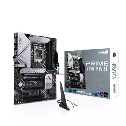 The ASUS PRIME Z690-P WIFI Motherboard from ASUS. Designed for both business professionals and gamers, this motherboard offers robust performance whether you are looking to push the limits of raw power or build a streamlined machine for everyday tasks. An Intel Z690 chipset powers this motherboard, offering an LGA 1700 socket, four dual-channel DDR4 RAM slots, four SATA III ports, and three M.2 interfaces. Install a wide range of graphics and utility cards with a multitude of expansion slots, including one PCIe 5.0 x16, one PCIe 4.0 x16, two PCIe 3.0 x16, and one PCIe 3.0 x1. An array of USB ports and headers allow you to connect resource-demanding peripherals such as external drives and more with USB 3.2 Gen 1 and Gen 2 Type-A Ports. The USB 3.2 Gen 2x2 Type-C port provides greater power for devices like audio interfaces and mass storage devices. Bluetooth 5.2 technology allows you to connect wireless devices such as speakers and controllers for a cable-free experience. Wi-Fi 6 (802.11ax) networking allows you to connect to wireless access points, or use the integrated Realtek 2.5 Gigabit Ethernet port if you prefer a wired connection so you can easily access cloud storage or stream your favorite media. The ASUS PRIME Z690-P WIFI Motherboard supports Windows 10 (64-Bit) as well as Windows 11 (64-Bit) right out of the box.