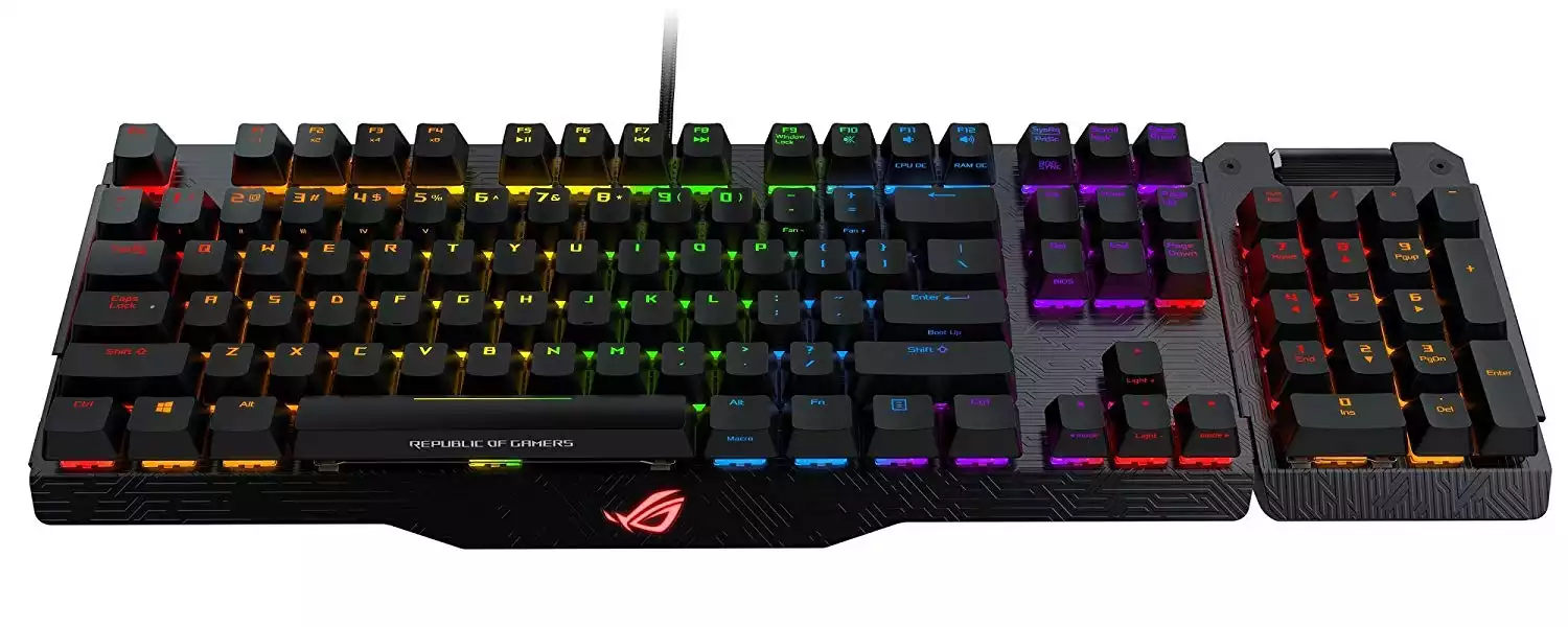 Asus ROG Claymore keyboard__ is the world's first RGB mechanical gaming keyboard with a detachable numeric keypad to give you flexible placement options when gaming. It features Cherry MX RGB switches to give you precise and responsive keystrokes and individually-programmable backlit keys with Aura sync RGB LED technology for unmatched levels of personalization. This 100% anti-ghosting keyboard has N-Key rollover technology, on the fly macro recording, and dedicated hotkeys for exclusive ASUS motherboard cooling and overclocking controls. ROG Claymore gives you the winning edge in the digital battlefield.