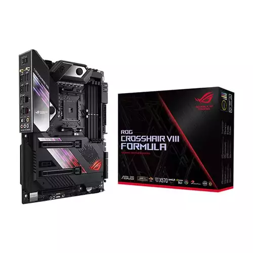 The ASUS ROG Crosshair VIII Formula AM4 ATX Motherboard is built on the AMD X570 chipset supporting second- and third-generation AMD Ryzen processors with an AM4 socket. It has four memory slots for up to 128GB of dual-channel DDR4 RAM, which can run up to 4800 MHz when overclocked. For storage, Asus ROG Crosshair VIII Formula equipped with eight SATA III ports and two M.2 slots. Asus ROG Crosshair VIII Formula with three PCIe 4.0 x16 slots for graphics cards, which can run at x8/x8/x4 when all slots are filled, and a single PCIe 4.0 x1 slot for other PCI-based hardware. Other integrated features of Asus ROG Crosshair VIII Formula is include Intel AX200 802.11ax Wi-Fi, Intel I211-AT Gigabit Ethernet, Aquantia AQC111C 5GbE LAN, and ROG SupremeFX 8-channel HD audio.
