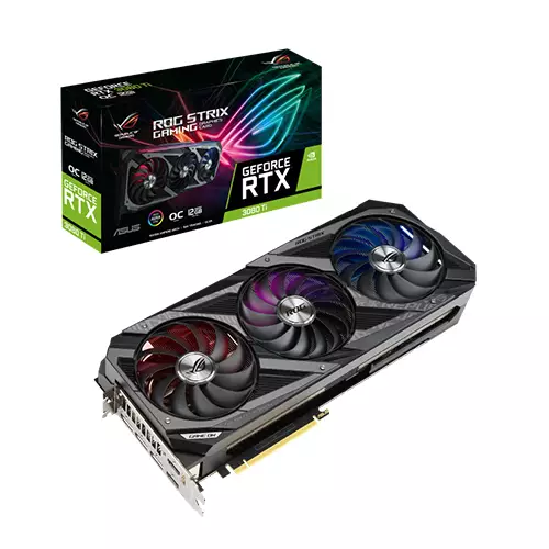 The ASUS ROG RTX 3080 Ti OC Graphics Card From Asus. The ASUS ROG RTX 3080 Ti OC Graphics Card brings the power of real-time ray tracing and AI to your PC games. The Ampere architecture features 2nd Gen RT Cores and 3rd Gen Tensor Cores. The ASUS ROG RTX 3080 Ti OC Graphics Card features 12GB of GDDR6X VRAM and a 384-bit memory interface, offering improved performance and power efficiency over the previous Turing-based generation. The front panel of the card features a variety of outputs, such as DisplayPort 1.4a and HDMI 2.1. HDMI 2.1 supports up to 48 Gb/s bandwidth and a range of higher resolutions and refresh rates, including 8K 60fps, 4K 120fps, and even up to 10K. The ASUS ROG RTX 3080 Ti OC Graphics Card is not just about high-resolution gaming. Computationally intensive programs can utilize the GPU's 10240 cores to accelerate tasks using CUDA and other APIs.For cooling, ASUS implemented triple Axial-tech fans, providing improved airflow and dispersion. There is also Aura Sync RGB lighting on the shroud and backplate. Using Aura Sync software, you can sync the RGB lights with other ASUS products for a customized gaming setup. With Aura Sync, you can sync to music, temperature-based color changing, or select from a variety of patterns and static options.