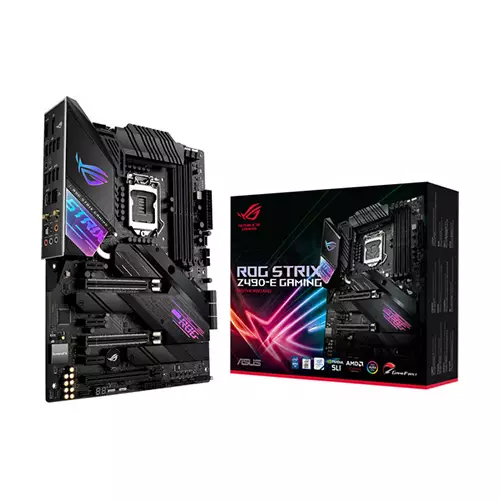 Powered exclusively by 10th Generation Intel Core processors, the Republic of Gamers Strix Z490-E Gaming LGA 1200 ATX Motherboard from ASUS features enhanced power delivery and an optimized cooling design with a larger surface area for improved heat dissipation. It also delivers AI enhancements and intuitive dashboards to help users overclock and tweak other various parameters more easily. The ROG Strix Z490-E Gaming fits in ATX-sized cases, supports the LGA 1200 socket and Intel Z4900 chipset, and is compatible with Windows.