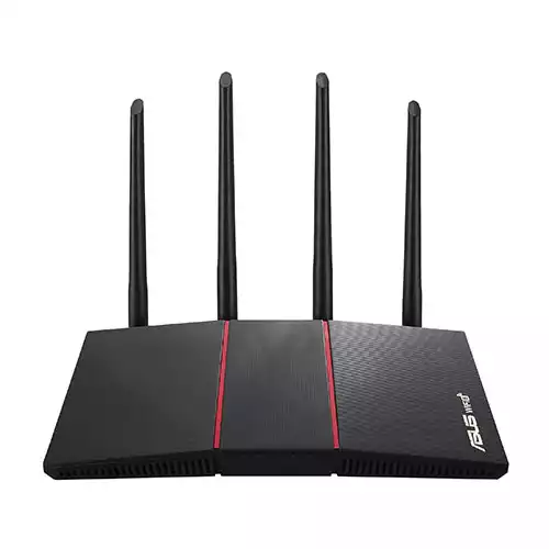 The ASUS RT-AX55 AX1800 Wireless Dual-Band Gigabit Router. Featuring four powerful external antennas and support for 802.11ax Wi-Fi, the RT-AX55 is designed to deliver wireless speeds of up to 1775 Mb/s over the 2.4 GHz and 5 GHz signal bands. With MU-MIMO and OFDMA technologies, the router can communicate with multiple devices simultaneously over long distances. With ASUS AiMesh, you can add select routers to create a mesh Wi-Fi network that can cover your entire home. The router connects to your modem through the Gigabit Ethernet WAN port. Four Gigabit Ethernet LAN ports are available for wired connections to devices such as computers, gaming consoles, smart TVs, and more. The RT-AX55 also includes lifetime access to AiProtection Classic, powered by Trend Micro, to provide comprehensive network security to help protect your connected devices from internet threats.