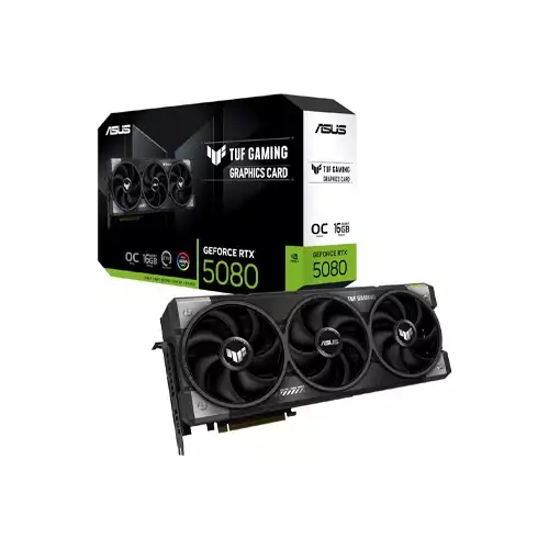 ASUS TUF Gaming GeForce RTX 5080 16GB GDDR7 OC Edition is a high-performance graphics card designed for serious gamers, content creators, and AI developers. Powered by NVIDIA’s cutting-edge RTX 50 series architecture, this GPU delivers exceptional speed, AI-enhanced performance, and real-time ray tracing. With 16GB of ultra-fast GDDR7 memory, a 256-bit memory interface, and 10,752 CUDA cores, the RTX 5080 ensures stunning visuals and ultra-smooth gameplay at high resolutions. The TUF Gaming design offers durability, advanced cooling, and military-grade components, making it a reliable choice for demanding users.