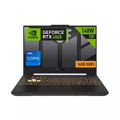 ASUS TUF Gaming A15 FX507VV Core i7 13th Gen RTX 4060 8GB Graphics Laptop is a powerful gaming laptop that runs on an Intel Core i7-13620H processor that can reach up to 4.9 GHz. Performance is smooth and effective thanks to this 10-core CPU (6 P-cores + 4 E-cores), 16 threads, and a 24MB CPU cache. 15.6-inch Value IPS-level display with FHD (1920 x 1080) resolution is the laptop's main display feature. The display has a brightness of 250 nits and can support a refresh rate of 144 Hz. Its anti-glare feature and support for G-Sync further enhance the immersive gaming experience. The 16GB DDR5-4800 RAM that comes with the laptop can be upgraded to 32GB. On a PCIe 4.0 NVMe M.2 SSD, it has 512GB of storage space. There is an additional M.2 slot available for SSDs. An Intel Iris Xᵉ Graphics with shared memory and an NVIDIA GeForce RTX 4060 Laptop GPU with 8GB GDDR6 memory handle the graphics. This guarantees fluid gameplay and excellent graphics. The laptop also has a 720P HD camera, a touchpad, a number pad, and a backlit chiclet keyboard with 1-zone RGB. It boasts a two-speaker setup with an integrated array microphone, support for Dolby Atmos and Hi-Res certification for headphones, and AI noise-canceling technology. It can be connected via HDMI, Thunderbolt 4, USB 3.2 Gen 2 Type-C, USB 3.2 Gen 1 Type-A, and RJ45 LAN ports. It is compatible with Bluetooth 5.2 and Wi-Fi 6 (802.11ax). The laptop is pre-configured with Windows 11 Home, a 30-day free trial of McAfee, a one-month trial for new Microsoft 365 customers, and a three-month Xbox Game Pass Ultimate subscription. A 4-cell Li-ion battery with a 90WHr capacity powers the laptop, and it can be fully charged in 30 minutes from 0% to 50%. There is a 240W AC adapter included. The laptop weighs 2.20 kg (4.85 lbs) and is finished in Jaeger Gray.