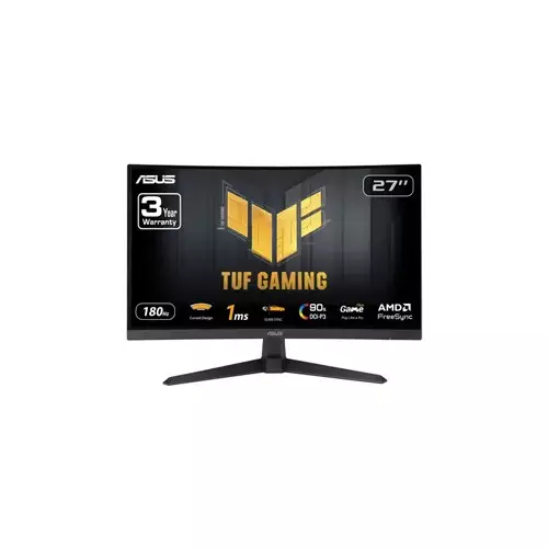 The ASUS TUF Gaming VG27VQ3B features a 27-inch Full HD (1920x1080) display with a 16:9 aspect ratio, perfect for delivering clear, crisp visuals during gameplay. Its 1500R curvature adds depth to the display, creating an immersive viewing experience, especially during fast-paced action games. The VA panel technology provides a high contrast ratio of 3000:1, ensuring deeper blacks and brighter whites, making it ideal for gaming in darker environments.The 180Hz refresh rate ensures that fast-moving visuals are smooth and lag-free, while the 1ms (GTG) response time minimizes motion blur, making this monitor perfect for high-paced games like first-person shooters or racing games. The Adaptive-Sync (FreeSync) technology eliminates screen tearing and stuttering for a more fluid gaming experience. Additionally, it features Flicker-Free and Low Blue Light technologies, reducing eye strain for longer gaming sessions.