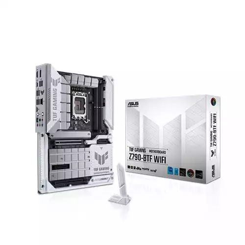 ASUS TUF GAMING Z790-BTF WIFI ATX Motherboard is a high-performance motherboard designed for gamers and professionals. Supporting Intel’s 12th to 14th Gen processors, this board is equipped with advanced features like Wi-Fi 7, high-speed USB 20Gbps ports, and extensive cooling solutions. Built with ASUS TUF components for durability and efficiency, it’s the ideal choice for users seeking robust performance and long-lasting reliability.