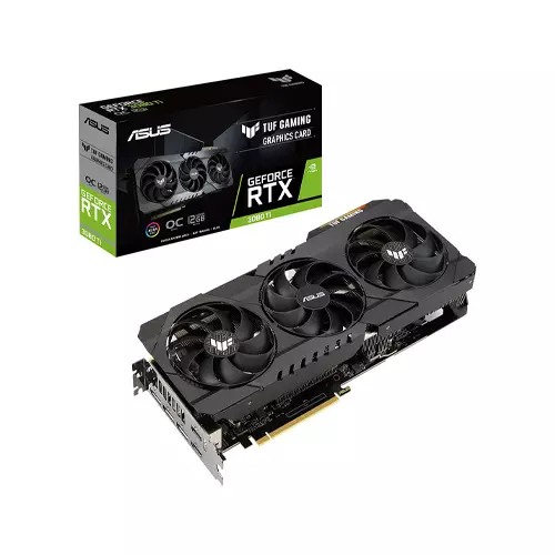 The ASUS TUF RTX 3080 Ti OC Graphics Card From Asus. The ASUS TUF RTX 3080 Ti OC Graphics Card brings the power of real-time ray tracing and AI to your PC games. The Ampere architecture features 2nd Gen RT Cores and 3rd Gen Tensor Cores. The GPU features 12GB of GDDR6X VRAM and a 384-bit memory interface, offering improved performance and power efficiency over the previous Turing-based generation. The ASUS TUF RTX 3080 Ti OC Graphics Card front panel of the card features a variety of outputs, such as DisplayPort 1.4a and HDMI 2.1. HDMI 2.1 supports up to 48 Gb/s bandwidth and a range of higher resolutions and refresh rates, including 8K 60fps, 4K 120fps, and even up to 10K. The ASUS TUF RTX 3080 Ti OC Graphics Card is not just about high-resolution gaming. Computationally intensive programs can utilize the GPU's 10240 cores to accelerate tasks using CUDA and other APIs. The TUF GAMING GeForce RTX™ 3080 Ti has been stripped down and built back up to provide more robust power and cooling. A new all-metal shroud houses three powerful axial-tech fans that utilize durable dual ball fan bearings. Fan rotation has been optimized for reduced turbulence, and a stop mode brings all three fans to a halt at low temps. Beneath, independent heatsinks for the GPU and memory keep thermals under tight control. Additional features, including TUF components, Auto-Extreme Technology, a new GPU bracket, and a backplate vent make the TUF a proper powerhouse. For builders looking for a new “old faithful”, this card has your back.