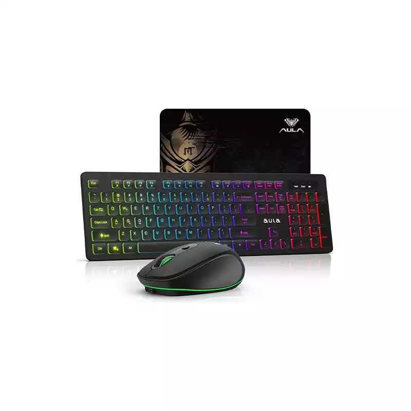 The AULA AC208 Wireless RGB Backlit, Rechargeable Keyboard and Mouse Combo in sleek black, available exclusively at TechLand BD. This gaming combo is the epitome of convenience and performance, offering a wireless experience without compromising on responsiveness. The keyboard's vibrant RGB backlighting, customizable through various modes, sets the stage for immersive gaming sessions. With a rechargeable design, both the keyboard and mouse ensure you stay in the game without interruptions. The 2.4GHz wireless connection delivers lag-free performance, granting you the freedom to play from anywhere within range. The ergonomic design of the keyboard and mouse provides comfort during extended gaming marathons, while the precision of the mouse's tracking enhances gameplay accuracy. Elevate your gaming prowess with the AULA Wireless RGB Backlit Keyboard and Mouse Combo, a fusion of style and functionality, now within your grasp at TechLand BD.