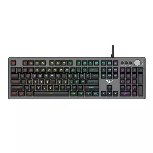 AULA F2028 Rainbow Wired Gaming Keyboard in Membrane.Multi-media shortcut function button design. 3 custom light mode buttons to record lighting effects according to player preferences. More than 10 million times of button lifespan and durable. .Multi-media shortcut function button design.3 custom light mode buttons to record lighting effects according to player preferences.More than 10 million times of button lifespan and durable.Rainbow colour backlight shows its elegant temperament and humanized function.User-friendly design with a set of shortcut function keys cooperated with Fn Key. Anti-ghosting = 26 keysAlluminium top case.Arrows switched to WASD.Fn + PgUp/Dn: brightness Knob:+-// backlight brightness.