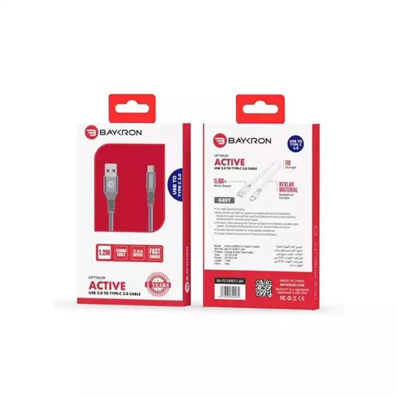 Baykron USB A to Type C 1.2M Cable – the ultimate charging and data transfer solution designed to withstand the rigors of daily use. Crafted with precision and durability in mind, this cable is engineered to provide reliable performance for all your charging needs. Featuring a length of 1.2 meters, the Baykron USB A to Type C cable offers the perfect balance of flexibility and reach, allowing you to comfortably use your devices while they charge. With a powerful 3A high-speed charging capability, this cable ensures fast and efficient charging for your Type C devices. What sets this cable apart is its construction using Kevlar fiber, a super-strong material renowned for its use in bulletproof vests, crash helmets, surfboards, and extreme sports gear. This premium material provides superior strength and ultimate durability, making the Baykron cable resistant to wear and tear. The cable jacket is meticulously crafted with a hardwearing fishnet braided design, offering both flexibility and durability. This unique braiding not only enhances the cable's strength but also adds a touch of sophistication to its appearance. To ensure long-lasting performance, the Baykron USB A to Type C cable features an aluminum casing that protects the circuit board inside the connector. This provides added protection against damage and ensures reliable connectivity over time. Moreover, the cable is designed with longer connector protection, extending its bend lifespan to withstand over 15,000 bends. This added durability means you can confidently use and maneuver the cable without worrying about wear and tear. Whether you're charging your devices or transferring data, the Baykron USB A to Type C 1.2M Cable delivers unmatched performance and reliability. With its premium materials, advanced features, and sleek design, this cable is the perfect companion for your Type C devices. Choose Baykron for a cable that combines strength, durability, and style to elevate your charging experience.