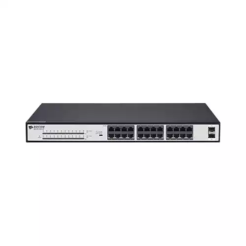 The BDCOM S1526D 24 port Unmanaged Switch uses For devices like IP cameras, wireless access points, and VoIP phones. It includes 24 GE PoE ports, each of which is capable of delivering up to 30W and supports 802.3af/at standards. For fiber optic connectivity, it also includes 2 GE SFP ports. High-speed and reliable network performance is guaranteed by the BDCOM S1526D Unmanaged Switch's switching capacity of 52Gbps and MAC capacity of 4K. A built-in AC power supply for the switch operates with voltages of 100V to 220V, 50Hz to 10%. The BDCOM S1526D 24 port Unmanaged Switch is fanless, which lowers noise levels and power usage. For network expansion and security surveillance, the BDCOM S1526D is a simple and affordable option.