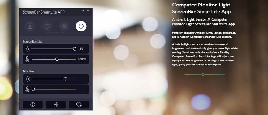 BenQ ScreenBar Lite A built-in light sensor can read environmental brightness and automatically give you more light while reading. Simultaneously, the exclusive e-Reading BenQ ScreenBar Lite Computer ScreenBar SmartLite App will adjust the laptop’s screen brightness according to the ambient light, giving you the ideally lit workspace.