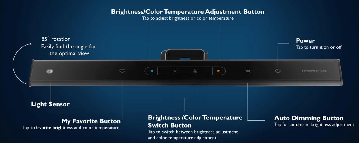 BenQ ScreenBar Lite touch control design allows you to easily turn on the light adjust the brightness or color temperature.With a light touch, the Auto Dimmer Mode is activated. Everything for your convenience