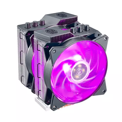 The dual tower heatsink has a combination of 2 sets of heatsink towers with 2 sets of MasterFan MF120R RGB. The uniquely designed heatsink allows bigger and more spread out surface area, while the MF120R RGB fans give added air pressure from the outside and inside the heatsink to generate massive cooling performance.