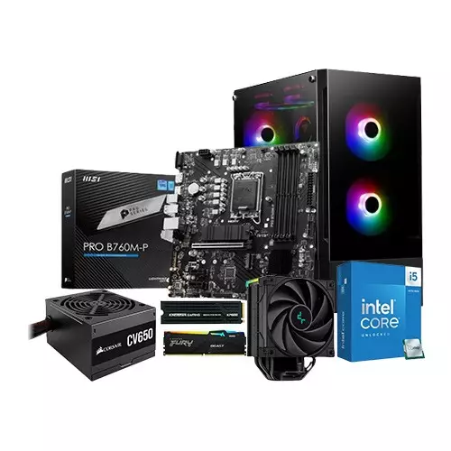 i5-14500 MSI PRO B760M-P Motherboard 16GB RAM 1 TB SSD Budget PC, now available at TechLand BD, designed to deliver reliable performance and efficiency for everyday computing tasks in Bangladesh. Equipped with the powerful Intel Core i5 14500 14th Gen Raptor Lake Processor, this PC ensures smooth multitasking and responsiveness, allowing you to tackle various applications with ease. Paired with the MSI PRO B760M-P DDR5 13TH GEN & 12TH GEN MATX MOTHERBOARD, featuring DDR5 memory support for enhanced speed and stability, this combination provides a solid foundation for your computing needs. The system is complemented by the DEEPCOOL AK400 DIGITAL ARGB CPU COOLER, ensuring efficient heat dissipation to maintain optimal performance. With 16GB of Kingston Fury Beast 6000MHz DDR5 RGB Desktop RAM, multitasking becomes seamless, allowing you to run multiple programs simultaneously without compromising performance. The AITC Kingsman K2 KP800 1TB SSD offers ample storage space for your files and applications while delivering fast data access speeds. Powered by the Corsair CV Series CV650 650 Watt 80 Plus Bronze Certified Power Supply, this PC is energy-efficient and reliable, providing stable power delivery for all your components. Housed in the Gamdias TALOS E3 Mid Tower ARGB Case, this budget PC not only offers a sleek and stylish design but also features ARGB lighting for a visually stunning setup. Whether you're browsing the web, working on documents, or enjoying multimedia content, the Intel Core i5-14500 MSI PRO B760M-P Motherboard 16GB RAM 1 TB SSD Budget PC delivers a balanced combination of performance, reliability, and affordability. Get yours today at TechLand BD and experience the convenience of a budget-friendly yet capable computing solution.