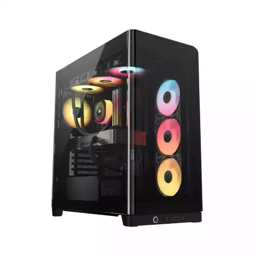 The CORSAIR FRAME 4500X RS-R ARGB Panoramic Glass Mid-Tower Desktop Case is a stunning combination of bold design, premium materials, and advanced cooling capability, created for PC builders who demand both performance and aesthetics. Crafted from high-quality steel, tempered glass, 3D-Y airflow steel, and durable plastic, this black mid-tower chassis redefines what a high-performance case should be. Its panoramic tempered glass side panel offers a clear, uninterrupted view of your powerful components, making it perfect for showcasing modern RGB builds. With support for Mini-ITX, Micro-ATX, ATX, and E-ATX (305mm x 277mm) motherboards, it ensures wide compatibility for a range of systems — from compact builds to full-sized gaming setups. When it comes to cooling, the CORSAIR FRAME 4500X truly shines. It supports an incredible fan configuration of up to 10 fans — three 120mm or two 140mm fans on the top, three 120mm or one 140mm at the bottom, three 120mm or two 140mm on the side, and one 120mm or 140mm at the rear. For liquid cooling enthusiasts, radiator support includes 120mm, 140mm, 240mm, 280mm, and 360mm sizes at the top, side, and rear, offering extreme flexibility for high-end cooling systems. The case comes equipped with RS ARGB Series fans, delivering powerful airflow and vibrant addressable RGB lighting that can be synchronized with your entire setup. It’s compatible with popular CORSAIR cooling systems like the H60, H100, H115, H150, and TITAN coolers, ensuring maximum thermal efficiency. Inside, the case provides excellent hardware clearance — GPU length up to 460mm, CPU cooler height up to 185mm, and PSU length up to 250mm (ATX form factor). It features one internal 3.5-inch drive bay and two 2.5-inch SSD bays for flexible storage expansion. The 37mm cable routing space ensures a clean and organized build, while full dust filtration helps maintain system longevity and cleaner airflow. Expansion options include seven horizontal or three vertical PCI slots, and yes, vertical GPU mounting is supported (riser card sold separately). The front I/O panel is conveniently equipped with one USB 3.2 Gen 2 Type-C, two USB 3.2 Gen 1 Type-A, and an audio in/out combo jack, giving you modern connectivity at your fingertips. Measuring 478 x 499 x 246mm and weighing around 11.58kg, the CORSAIR FRAME 4500X RS-R ARGB is both compact and spacious — offering exceptional airflow without compromising on design.