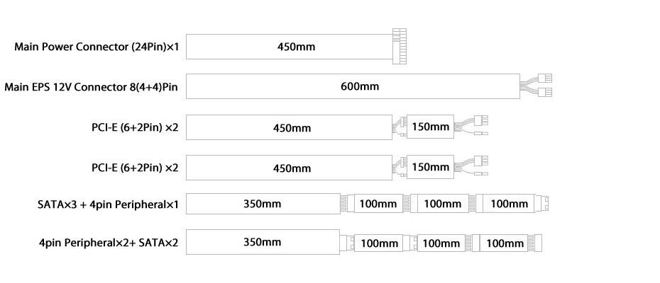 EPS 12V Connector 8(4+4)Pin PCI-E (6+2)pin×2 PCI-E (6+2)pin×2 SATA×3+4pin Peripheral×1 4pin Peripheral×2+SATA×2 |