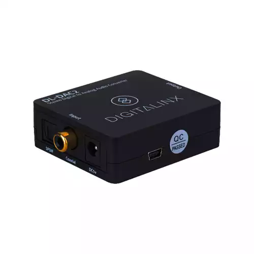 The Digitalinx DL-DAC2 is an easy-to-use device that converts coaxial and optical S/PDIF digital audio into stereo analog audio, perfect for multimedia components such as TVs or CD/DVD/Blu-ray players that do not feature analog outputs. Use the dual RCA phono outputs to connect the unit to an amplifier or powered speakers, and use the 1/8" mini stereo output for simultaneous headphone monitoring. The DL-DAC2 supports PCM digital audio at resolutions up to 96 kHz and can be powered via the included power supply or alternately via USB.