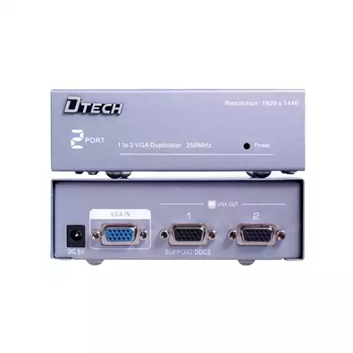 The DTECH DT-7252 VGA splitter is a device that allows you to display the same VGA video signal on two separate monitors or projectors. It has one VGA input and two VGA output ports, capable of splitting the signal up to a frequency of 250 MHz. The splitter can support resolutions up to 1920x1440 at 60Hz, making it ideal for use in classrooms, conference rooms, trade shows, and other similar settings. This product is designed to be easy to use, with plug-and-play functionality that requires no additional software or drivers to install. It also supports hot-swapping, allowing you to connect or disconnect monitors without needing to power off the splitter or computer. The DT-7252 VGA splitter is built with high-quality materials to ensure reliable performance and durability. Its compact size makes it perfect for travel or use in tight spaces, while its metal housing provides protection against damage from accidental drops or impacts. Overall, the DTECH DT-7252 VGA splitter is a versatile and reliable solution for anyone who needs to display the same VGA video signal on multiple screens simultaneously. The large selection of DTECH DT-7252 1 TO 2 250MHZ VGA SPLITTER available at Techland BD is well recognized.