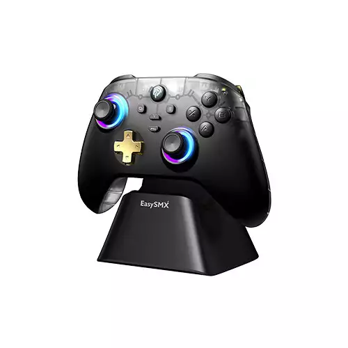 EasySMX D05 Multiplatform Gaming Controller in sleek black, available for purchase at Tech Land BD in Bangladesh, is a versatile and high-performance gamepad designed for gamers across multiple platforms. Compatible with Nintendo Switch, Switch Lite, Switch OLED, Windows 7/8/8.1/10/11, and Android/iOS devices, it offers seamless connectivity through 2.4GHz wireless, Bluetooth, and wired USB-C options, ensuring lag-free gameplay. The controller features the advanced EasyPos™ D-pad with millisecond-level responsiveness and precise 8-way control, perfect for genres like fighting games and platformers. Its TMR (Touch Magnetic Resonance) analog sticks deliver a 1000Hz polling rate for exceptional accuracy and durability, minimizing stick drift for smooth performance in FPS and racing titles. The Elite 2-Way Trigger Lock system allows switching between Hall Effect triggers for nuanced inputs and microswitch triggers for rapid response, catering to varied gaming needs. Equipped with full mecha buttons for tactile feedback and faster actuation, the D05 enhances responsiveness during intense sessions. Weighing 300g with a compact size of 15.5 x 5.27 x 10.47 cm, its ergonomic design ensures comfort during extended play, complemented by customizable RGB lighting for a personalized aesthetic. The included intelligent charging dock (11.53 x 7.62 x 6.81 cm) features auto-reconnect functionality and supports a 1000mAh battery for long-lasting gaming sessions. Additional features include two programmable buttons, four-level vibration adjustment, and 6-axis motion control for enhanced Switch gameplay. Backed by a 1-year warranty, the EasySMX D05, available at Tech Land BD, combines cutting-edge technology with user-centric design, making it an ideal choice for both competitive and casual gamers in Bangladesh.What devices does the D05 support?