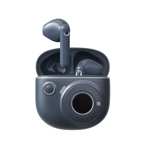 The OLED display on the charging case is complete with icons indicating both Bluetooth connection and battery levels.