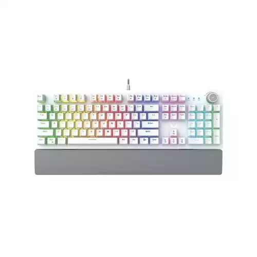 This 104-key mechanical keyboard uses durable blue switches rated for 50 million clicks, providing satisfying tactile feedback ideal for gaming and typing. The double-injection keycaps ensure long-lasting legends, while the metal top plate offers superior durability. RGB enthusiasts will appreciate the 22 dynamic lighting modes with gradient effects. Gaming features include full N-key rollover anti-ghosting, 1000Hz polling rate for instantaneous response, and 12 dedicated multimedia keys. The package includes a detachable wrist rest for comfort during extended sessions, connected via a high-quality 1.8m nylon braided cable.
