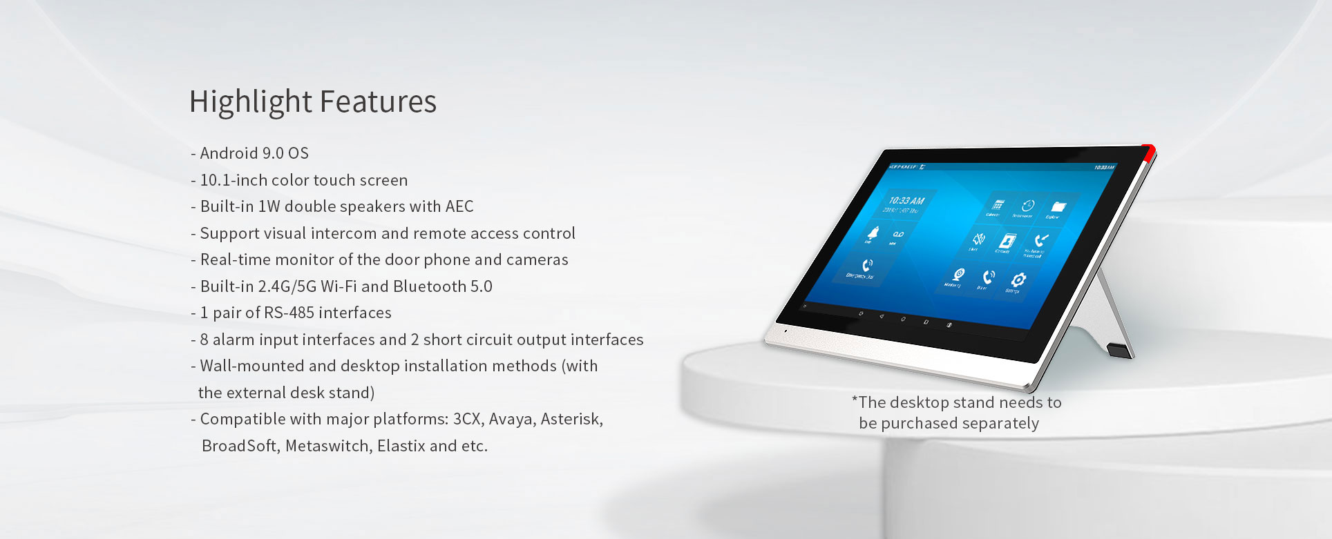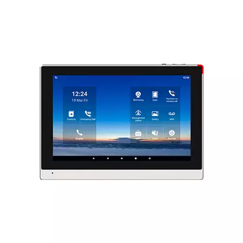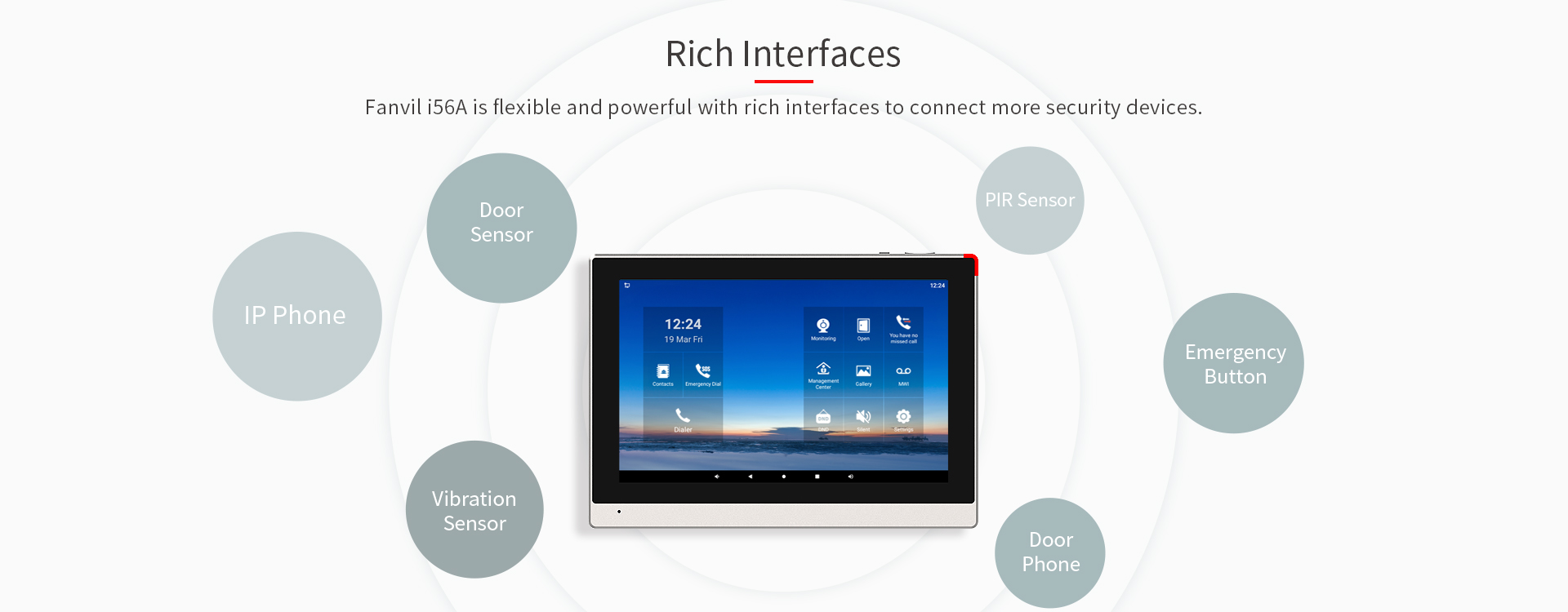 The FANVIL I56A SIP Indoor Station is a communication device that runs on the Android 9.0 operating system. It features a large 10.1-inch 280X800 color touch screen that provides a visually pleasing experience. The audio quality is crisp and clear, thanks to its HD Audio feature, which supports G.722 and Opus wideband codecs. The device also features 1W double speakers for high-quality audio playback. In addition, the FANVIL I56A SIP Indoor Station offers high-quality video calling with a resolution of up to 1080P and uses H.264 video codec. It supports ONVIF protocols, allowing users to integrate it with other compatible devices. This indoor station has six SIP lines, making it ideal for use in large offices or businesses. Additionally, the station comes equipped with built-in Bluetooth and WiFi, supporting both 2.4G/5G frequencies. For ease of use, the device comes with three buttons for quick access to frequently used features. The FANVIL I56A SIP Indoor Station also has an alarm input interface consisting of eight inputs, two short circuit outputs, an RS-485 interface, a TF interface, and a USB port. It can be wall-mounted or installed on a desktop. The device also supports Power over Ethernet (PoE) functionality, allowing users to power the device through an Ethernet cable. Finally, the device comes with a 1-year warranty from the manufacturer.