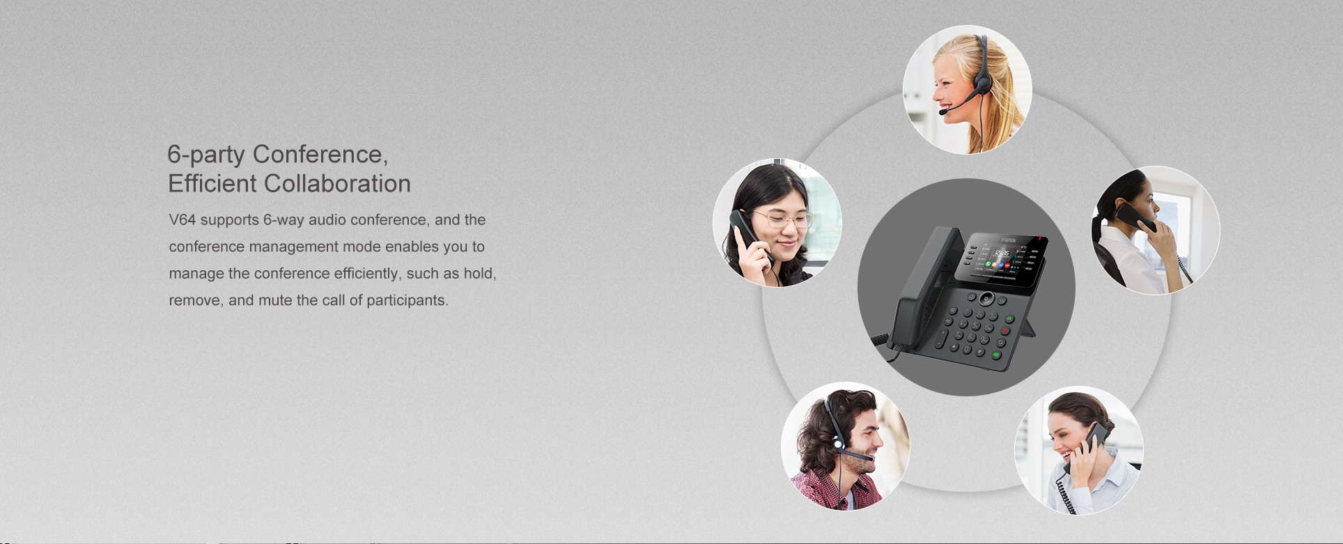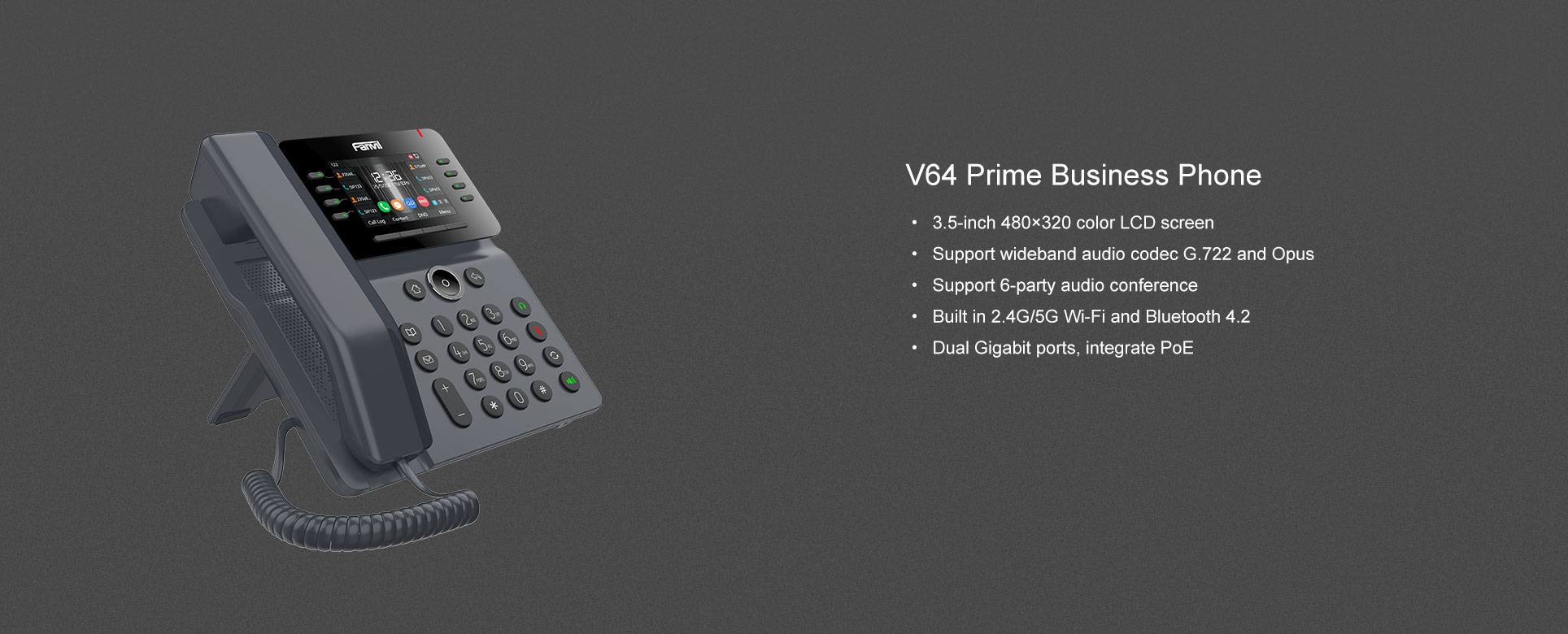 The FANVIL V64 Prime Business Phone is a high-quality phone designed for businesses. It runs on the Linux operating system and features a 3.5-inch 480*320 colored screen, making it easy to navigate and view information. The device comes with 21 DSS keys and can support up to 12 SIP lines. With a local phone book that can hold up to 1000 contacts, users can easily manage their contacts. The phone also has a six-way local audio conference feature, which allows for easy collaboration among team members. It supports wideband codec G.722 and Opus, as well as narrowband codecs such as G.711, G.729A/B, and iLBC, providing clear communication. The device has USB Type A x 1 port, which can be used to connect with USB headset & USB and a built-in Bluetooth version 4.2. It also has built-in 2.4G/5G WiFi and supports PoE. The device is compatible with EHS Headset and IPv6. The FANVIL V64 Prime Business Phone comes with a 1-year warranty, ensuring customer satisfaction.