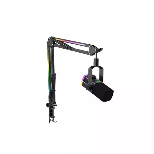 FIFINE AmpliGame AM8PROT is a complete dynamic microphone kit designed for gaming, streaming, podcasting, and content creation. It delivers professional-quality audio while adding a stylish visual touch to any setup. The microphone features a cardioid dynamic capsule that captures clear, rich sound and minimizes background noise. It supports both USB-C and XLR connections, allowing flexible use across computers, mixers, and audio interfaces. The mic records at up to 24-bit/48 kHz, ensuring high-resolution audio for streams, recordings, or voiceovers. The kit includes a fully adjustable boom arm stand. The arm allows precise microphone placement and saves desk space. It has a sturdy clamp to keep the mic secure during long sessions. The microphone and boom arm feature vibrant RGB lighting. Users can choose from over 240 colour combinations and patterns, including beat-sync, flowing, and static modes. The lighting adds style and immersion to gaming and streaming setups.