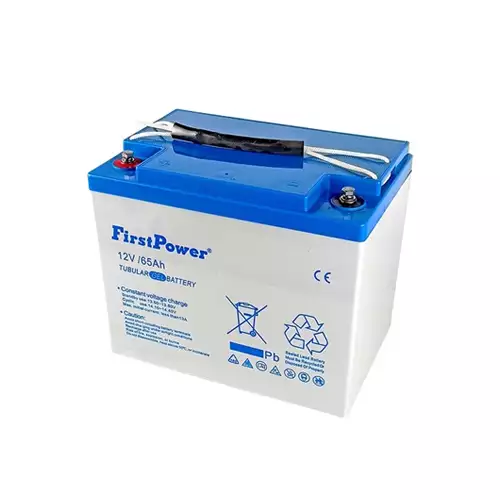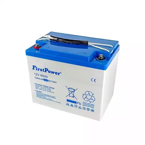 Firstpower 12V 65Ah tubular gel battery is a high quality sealed lead acid rechargeable battery that is engineered to provide superior performance. Long service life for your stand alone solar system or any other battery based setup. This battery is a maintenance-free, non spillable sealed valve regulated lead acid (VRLA) AGM battery.