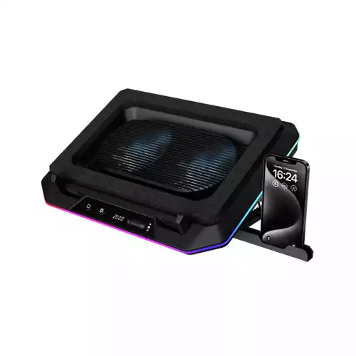 Gamdias AETHER P1 RGB 2000 RPM Laptop Cooler With Phone Stand is a high-performance cooling pad designed to keep gaming laptops and productivity machines running at optimal temperatures. Built with dual 135mm fans that deliver speeds from 300 to 2000 RPM, it ensures powerful airflow of 104.3 CFM per fan while maintaining a noise level of just 38.5 dBA, striking the perfect balance between cooling efficiency and quiet operation. Crafted from durable ABS plastic, the cooler measures 433 × 328 × 68 mm and is compatible with laptops over 15.6 inches, making it suitable for most modern devices. The AETHER P1 features 11 RGB lighting modes with vibrant blue LED fans, adding a stylish touch to your gaming setup. Its LCD control panel allows users to adjust fan speed and lighting effects easily, while the seven height adjustment levels provide ergonomic comfort for long sessions. Equipped with USB Type-C and USB-A ports, it ensures versatile connectivity, while the stable stoppers and built-in phone stand enhance usability. The high-elasticity foam padding secures laptops firmly, preventing slips during intense use. With its combination of cooling power, customizable lighting, and ergonomic design, the Gamdias AETHER P1 is an excellent choice for gamers, professionals, and creators in Bangladesh who demand performance and style.