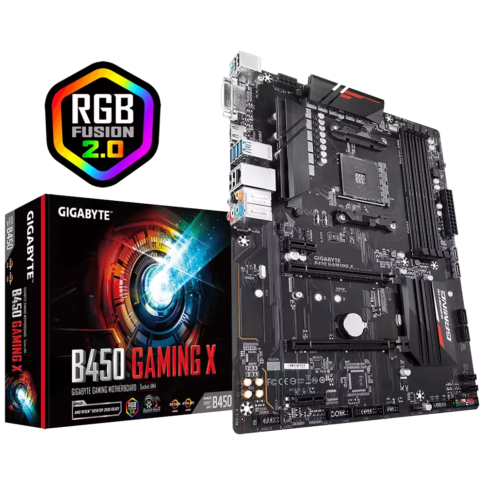 The AMD B450 Gaming X AM4 ATX Motherboard from GIGABYTE is built on the AMD B450 chipset, supporting Ryzen processors with an AM4 socket. It has four memory slots that can hold up to 64GB of DDR4 RAM running at up to 2933 MHz when overclocked. For storage, it's equipped with six SATA III ports and a single M.2 slot, which utilizes the PCIe 3.0 x4 interface for speeds of up to 32 Gb/s when used with an appropriate drive. While it's equipped with DVI-D and HDMI outputs for integrated graphics, this motherboard also has one PCIe 3.0 x16 slot for a graphics card as well as a PCIe 2.0 x16 and two PCIe 2.0 x1 slots for other PCIe-based hardware. Other notable integrated features include Realtek ALC892 7.1-channel HD audio, Realtek ALC892 Gigabit LAN, and MSI Mystic Light RGB lighting.
