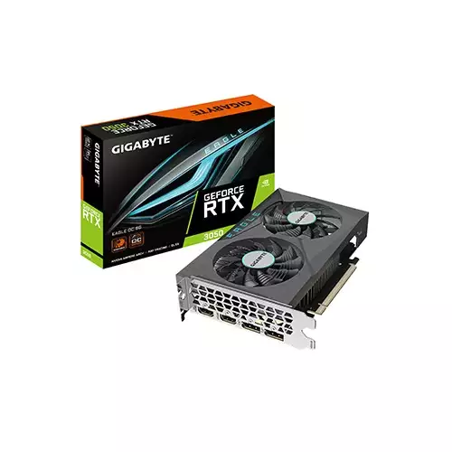 Gigabyte GeForce RTX 3050 EAGLE OC 6 6GB GAMING Graphics Card, now available at TechLand BD, designed to elevate your gaming experience with cutting-edge performance and stunning visuals in Bangladesh. Powered by the GeForce RTX 3050 graphics processing unit, this card delivers exceptional gaming performance, whether you're exploring virtual worlds or conquering the latest titles. With a core clock of 1500 MHz (Reference Card: 1470 MHz) and 2304 CUDA Cores, it ensures smooth and responsive gameplay, allowing you to immerse yourself in the action without compromise. The 6 GB of GDDR6 memory, clocked at 14000 MHz, combined with a 96-bit memory bus, offers ample memory bandwidth for high-resolution textures and fluid gameplay. Equipped with PCI-E 4.0 support, it ensures lightning-fast data transfer rates, unleashing the full potential of your gaming rig. With a digital maximum resolution of 7680x4320 and support for multi-view on up to 4 displays simultaneously, the Gigabyte GeForce RTX 3050 EAGLE OC 6 guarantees breathtaking visuals and immersive gaming experiences. Compact in size, with dimensions of L=192 W=117 H=36 mm and an ATX PCB form factor, it fits seamlessly into a wide range of PC builds, ensuring compatibility and flexibility. Compatible with DirectX 12 Ultimate and OpenGL 4.6, it delivers unparalleled visual fidelity and realism, bringing your games to life with stunning graphics and effects. With a recommended PSU of 300W and no power connectors required, installation is hassle-free, allowing you to focus on gaming without worrying about power requirements. Connect with confidence using the DisplayPort 1.4a *2 and HDMI 2.1 *2 outputs, ensuring compatibility with the latest displays and peripherals. Each purchase includes a quick guide to help you get started quickly and easily. Elevate your gaming setup with the Gigabyte GeForce RTX 3050 EAGLE OC 6 6GB GAMING Graphics Card, available now at TechLand BD.