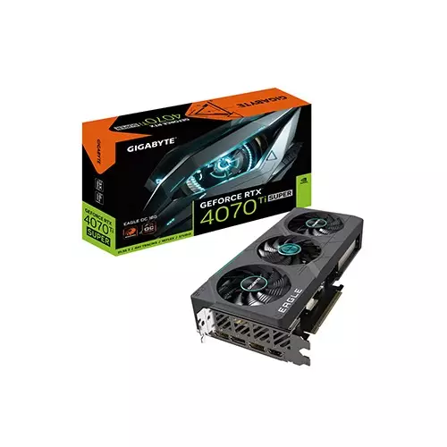 Gigabyte GeForce RTX 4070 Ti SUPER EAGLE OC 16G 16GB Graphics Card, now available at TechLand BD, designed to redefine gaming and graphics performance with unparalleled power and precision in Bangladesh. Powered by the GeForce RTX™ 4070 Ti SUPER graphics processing unit, this card sets a new standard for gaming excellence, delivering extraordinary visual fidelity and blistering frame rates. With a core clock of 2640 MHz (Reference card: 2610 MHz) and a staggering 8448 CUDA® Cores, it ensures smooth and responsive gameplay even in the most demanding titles, allowing you to experience gaming at its finest. The massive 16 GB of GDDR6X memory, clocked at 21 Gbps and paired with a 256-bit memory bus, provides lightning-fast data access and superior texture detail, enabling you to immerse yourself in lifelike environments and breathtaking visuals. Equipped with PCI-E 4.0 support, it maximizes bandwidth and throughput, unleashing the full potential of your gaming rig for unparalleled performance. With a digital maximum resolution of 7680x4320 and support for multi-view on up to 4 displays simultaneously, the Gigabyte GeForce RTX 4070 Ti SUPER EAGLE OC 16G guarantees stunning visuals and immersive gaming experiences like never before. Despite its powerful performance, this graphics card maintains a compact form factor, with dimensions of L=261 W=126 H=50 mm and an ATX PCB form factor, ensuring compatibility with a wide range of PC builds. Compatible with DirectX 12 Ultimate and OpenGL 4.6, it delivers cutting-edge visual effects and realism, elevating your gaming experience to new heights. With a recommended PSU of 750W and a single 16-pin power connector, installation is straightforward, providing peace of mind and stability for your gaming endeavors. Connect with confidence using the three DisplayPort 1.4a outputs and one HDMI 2.1a output, ensuring seamless compatibility with the latest displays and peripherals. Each purchase includes a quick guide and a convenient 16-pin to two 8-pin power adaptor, making setup hassle-free. Elevate your gaming setup with the Gigabyte GeForce RTX 4070 Ti SUPER EAGLE OC 16G 16GB Graphics Card, available now at TechLand BD.